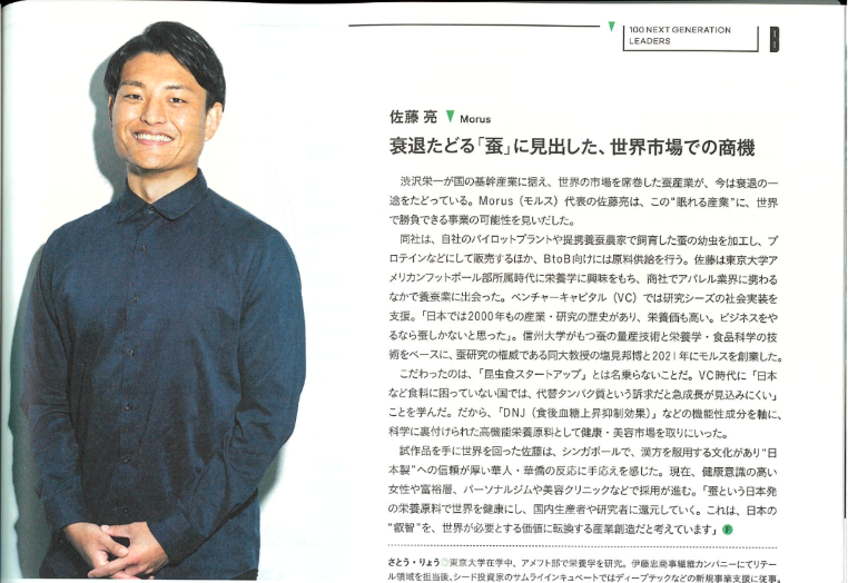 5000年以上前に中国で始まり、日本の経済発展を支えてきた養蚕は、いま消えゆく伝統となりつつあります。カイコ研究世界トップクラスの信州大学との共同研究から見えてきたのは、カイコが持つ驚くべき栄養の力。粉末は抹茶のような香りと色合いを持ち、健康維持に役立つ多様な機能性も備えています。この、伝統と機能性を融合した唯一無二の素材は、そのままでも製品応用でも活用でき、これからの社会に新たな選択肢をもたらします。