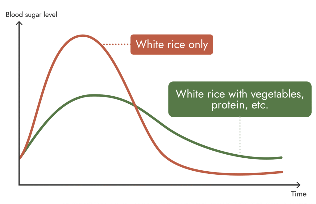 白米、パン、麺などの精製度が高い炭水化物を単独で摂取すると、急激な血糖上昇を招きます。