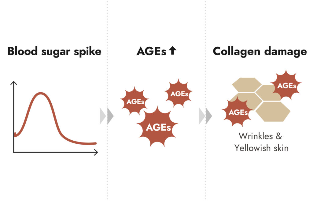 この急激な血糖変動は、体内で酸化ストレスや炎症を引き起こし、結果として**糖化反応と最終糖化産物(AGEs)の形成**を促進。これが肌の弾力低下やくすみにつながります。